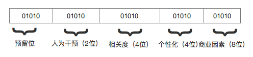 將不同的權重維度單獨計算,生成一個長位數的標識符,每個權重在標識符上有自己的位置。按照優先級的順序從左到右依次排列。考慮到機器計算的易用性上,可以在加權時使用十進制,然后統計時轉換成二進制即可。類似下圖這樣,位數和排序可以根據具體業務場景制定。