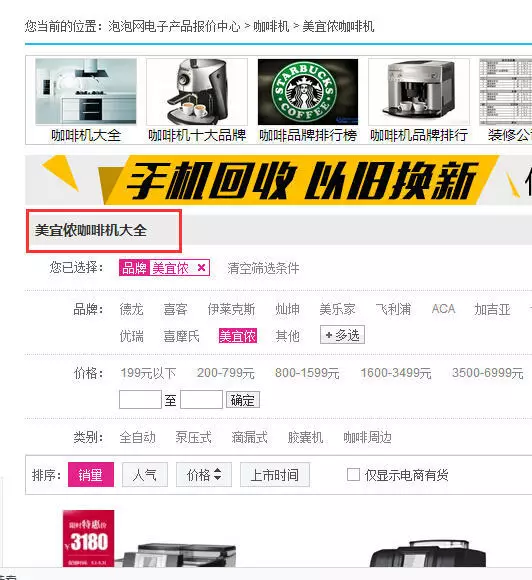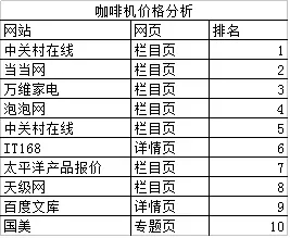 通過排名頁面類型的分析,以及通過關(guān)鍵詞的共性分析,價(jià)格類的關(guān)鍵詞,排名前10的站點(diǎn)頁面類型更偏向于是使用欄目頁面類型。如,咖啡機(jī)價(jià)格,排名前10的分別是一些商城的欄目頁。