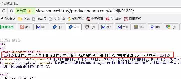 確定好著陸頁后,如果是個(gè)大型的網(wǎng)站,那么一般是由產(chǎn)品經(jīng)理確定原型圖(即著陸頁形態(tài)),然后SEO輸出需求文檔。那么,在確定好的頁面上,如何進(jìn)行頁面關(guān)鍵詞布局呢?以泡泡網(wǎng)-咖啡機(jī)價(jià)格欄目頁為例來說明:http://product.pcpop.com/kafeiji/01222/ 打開此頁面,并進(jìn)行右鍵—>源代碼查看。以下這幾個(gè)重點(diǎn)標(biāo)簽一定要布局上關(guān)鍵詞。