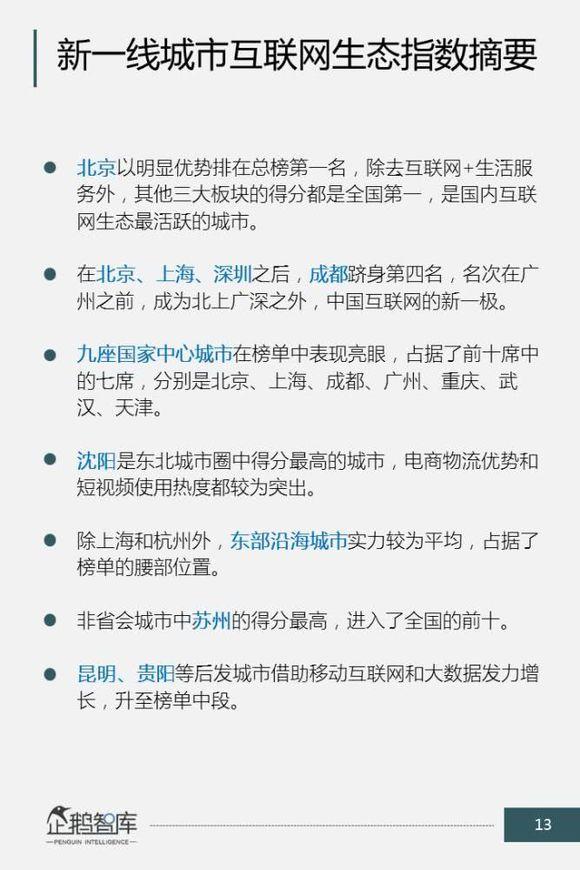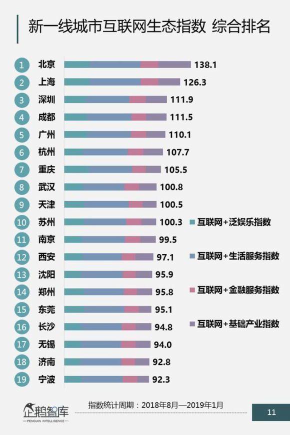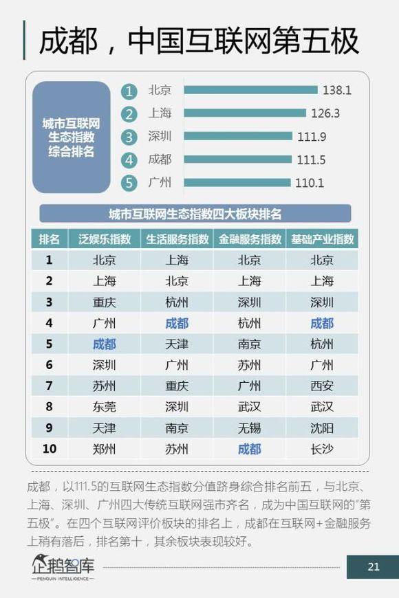 成都全搜索新聞網(wǎng)2月21日訊 近日,騰訊企鵝智酷發(fā)布2019中國城市互聯(lián)網(wǎng)生態(tài)指數(shù)排名榜,成都以111.5的互聯(lián)網(wǎng)生態(tài)指數(shù)躋身綜合排名前五,與北京、上海、深圳、廣州齊名,成為中國互聯(lián)網(wǎng)的“第五極”。