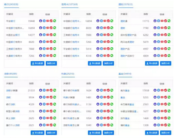 接下來我們要在這近百萬的理財詞庫中,找到最能帶來流量的詞匯,這里我們利用百度PC指數(shù)、360指數(shù)、百度移動指數(shù)、競價規(guī)劃師PC搜索量、競價規(guī)劃師移動搜索量、競價規(guī)劃師競爭度: