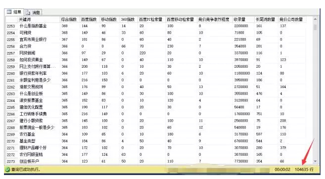 通過以上公式我們可以篩選出行業(yè)中最能帶來流量的一批詞,從百萬詞庫中篩選出104635個流量詞。