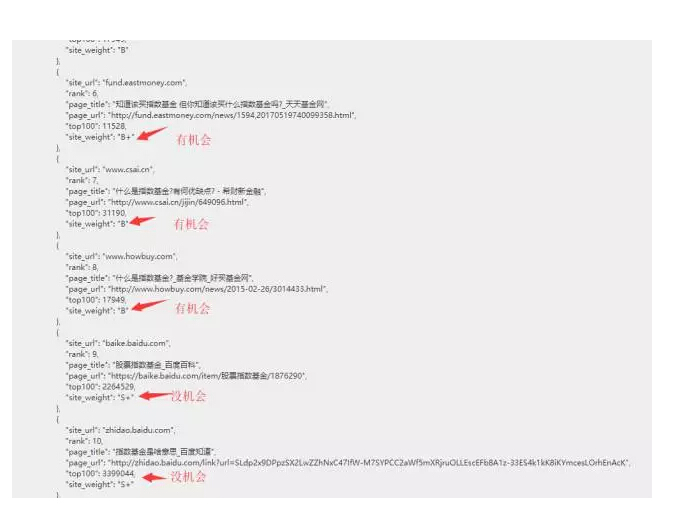 例如上圖中的Title,就沒有完全包含“什么是指數(shù)基金”這個詞,只不過是搜索引擎為了補充結(jié)果而放入的索引,那我們也可以把這些位置標(biāo)記為有機會。
