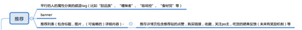 大家明白了么,所謂app“內容”的產生,就是我上述這些奇怪東西的綜合(當然其實并沒有上述這么簡單,這個以后有機會細講),比如我們從上面的論述當中,我可以歸納出這款“什么值得吃”app的首頁“推薦”應該具有的信息如下: