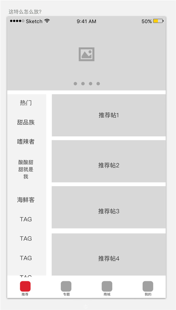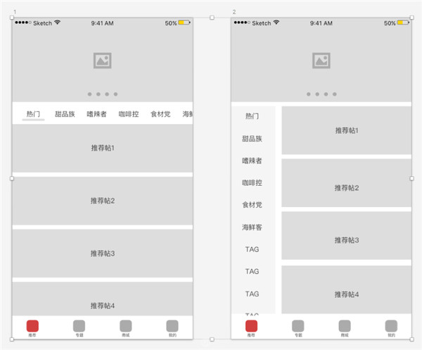 第二,由于右邊的tag占據了推薦貼的位置,導致推薦貼可能沒有左邊的那種展現(xiàn)形式更加醒目。但是相對的,圖右的優(yōu)勢在于,由于豎向排列tag可以讓一個屏幕顯示更多的tag,這一點就需要取舍,比如一個產品的初期沒準備放這么多切換tag的話,還是建議用左邊那種。更深層次的,外賣產品之所以用右邊這種形式是因為力求一屏展示更多的菜,而且外賣產品的左側tag一般是一家店鋪的菜的品類,用戶下滑菜品配合點擊品類,點完即走,很方便(京東和淘寶電商類平臺也是類似的)。但是比如早期的今日頭條只能采用左邊的這種形式,因為頭條是需要用戶長時間沉浸的,比如用戶選中一個“體育”的tag一般要看好久好久,用戶需要沉浸在這個tag下的內容中,那這個時候顯然用右邊這種設計方式讓tag常駐屏幕左側是不合適的。
