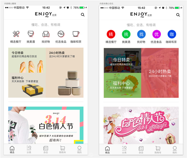 你們可以看到左右兩張圖,左邊是enjoy的精選頁,右邊是我隨手糟蹋的,大家會發(fā)現(xiàn)其實信息內容一模一樣,但是左邊的level和右邊的level大家一眼就能看出來區(qū)別吧,如果出現(xiàn)右邊這樣的UI稿那只能說明這個團隊在內容的視覺優(yōu)化上面不!用!心!(我是沒用力糟蹋不然我可以辣得你們半天睜不開眼睛哈哈哈)