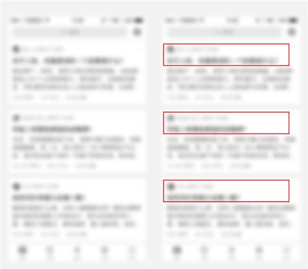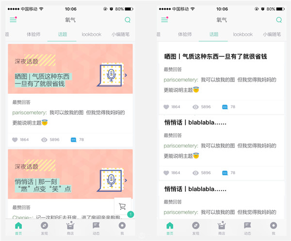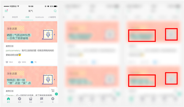 左邊是氧氣的原UI,右邊是我做的對比圖。顯然,關于文字優(yōu)化輔助視覺對焦這一點,氧氣的設計師顯然深諳此道,它們沒有按照右邊那種傳統(tǒng)辦法設計這個頁面,而是把每一個深夜話題的題目都變成了一張圖,變成一張圖還不算,還在這張圖上面用淺綠色“劃了重點”,這樣雖然加大了設計師的工作量(其實也還好就是給到話題title換個字出張圖而已),但是這個頁面正是因為這樣的處理,能讓用戶第一眼聚焦到標題title上: