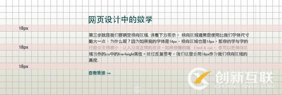 橫向區域的高度通常會比筆者們字體尺寸略大一點,為什么呢?因為如果筆者的字體是14px,橫向區域也是14px,那你的字與字的行距會變得很小,讓人沒法正常的閱讀。字的行距對于平面設計和網頁設計有著不同的意思-由于篇幅有限會在將來的文章中繼續探討這個話題。如果你懂前端 (html & css), 你可以把橫向區域當作的css中的line-height屬性。經過反復思考,筆者們這里會用18px作為筆者們橫向區域的高度.