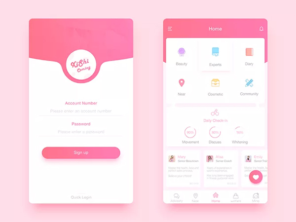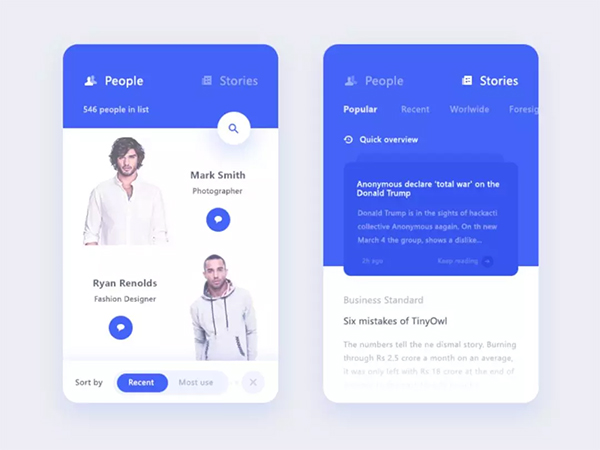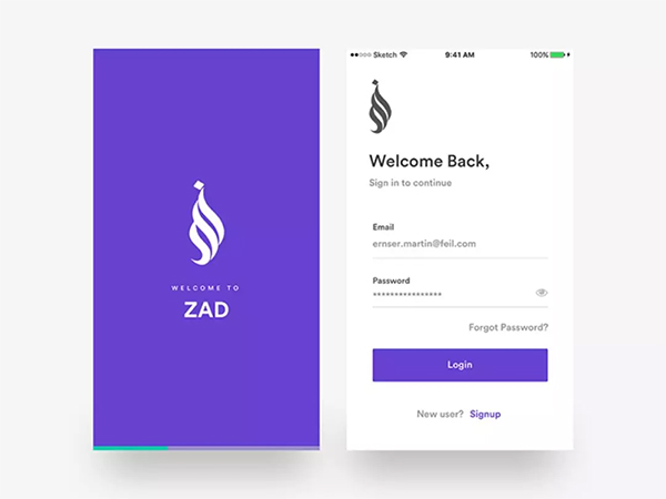 雖然與白色相比,藍紫色會更具吸引力,但在左圖中,我們卻發現中間白色的logo更為吸引,這是因為留白,周圍沒有任何元素干擾。再看看右圖,界面雖然有很多元素,但最吸引人的依然是藍紫色的按鈕,這是因為與界面的其他顏色相比,藍紫色更為搶眼,因而成為視覺焦點。
