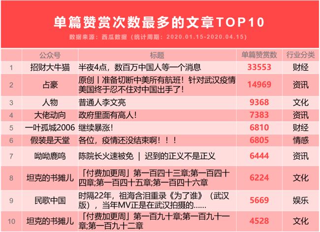 那么,什么樣的內(nèi)容可以吸引用戶付費(fèi)呢?根據(jù)西瓜數(shù)據(jù)所收錄的 500 萬公眾號(hào)發(fā)文數(shù)據(jù)進(jìn)一步觀察,通過贊賞文章數(shù)最多的公眾號(hào)TOP10,以及單篇贊賞次數(shù)最多的文章TOP10 中,文化和資訊行業(yè)的公眾號(hào)發(fā)文內(nèi)容更容易獲得讀者的贊賞。