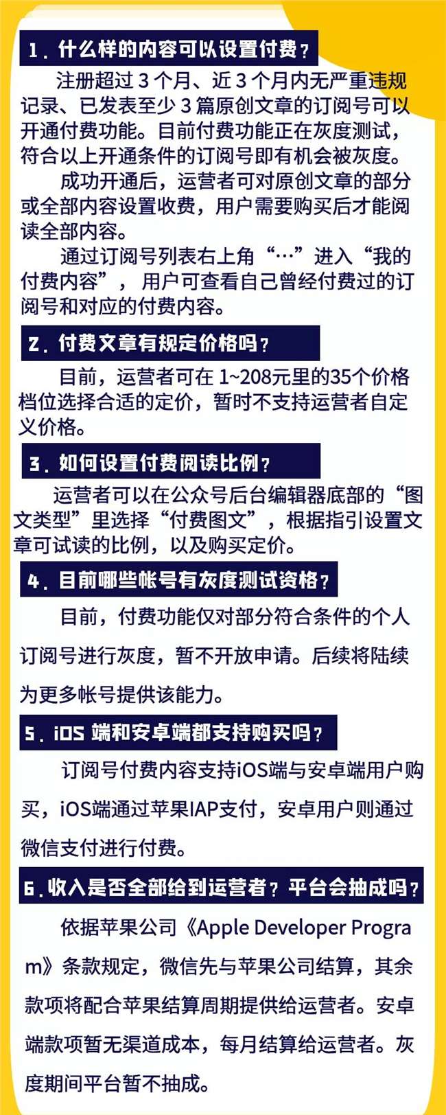 2020 年 1 月 15 日,騰訊微信團(tuán)隊(duì)宣布,微信正在對訂閱號(hào)付費(fèi)閱讀進(jìn)行灰度測試,符合測試條件的運(yùn)營者可以前往公眾平臺(tái)開通付費(fèi)功能。微信官方也對這一次開啟付費(fèi)模式給出了相應(yīng)的解釋:好的內(nèi)容創(chuàng)作者,值得更好的受益,微信平臺(tái)努力為優(yōu)質(zhì)的內(nèi)容創(chuàng)作者提供更多能力,讓創(chuàng)造價(jià)值的人體現(xiàn)價(jià)值。那么付費(fèi)功能具體是什么?微信團(tuán)隊(duì)對訂閱號(hào)付費(fèi)能力的細(xì)節(jié)解答如下: