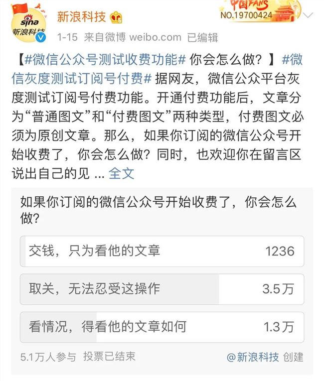 面對微信團(tuán)隊(duì)投下的“重磅炸彈”,新浪科技在微博上發(fā)起了投票調(diào)查,通過“如果你訂閱的微信公眾號(hào)開始收費(fèi)了,你會(huì)怎么做?”調(diào)查了解用戶對此事的態(tài)度。其中,大約七成網(wǎng)友表示會(huì)取關(guān),剩余大部分網(wǎng)友表示,會(huì)看文章具體情況而定,只有大約2%-3%的網(wǎng)友選擇了付費(fèi)閱讀。