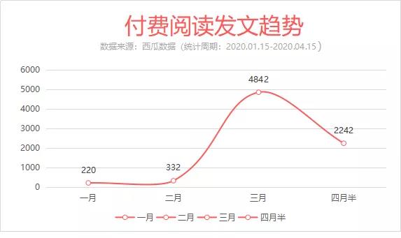 1 月 15 日至 4 月 15 日,西瓜數(shù)據(jù)檢測到 2369 個(gè)賬號(hào)使用了付費(fèi)閱讀功能,可以看出在灰度測試的開始初期,只有小部分賬號(hào)愿意嘗鮮使用付費(fèi)功能。而在 2 月底“好運(yùn)哥”單篇收入 81 萬元走紅后,三月份迎來付費(fèi)閱讀發(fā)文的爆發(fā)期,有 4842 篇付費(fèi)內(nèi)容被發(fā)布,其中財(cái)經(jīng)、科技、資訊等行業(yè)多個(gè)賬號(hào)將付費(fèi)內(nèi)容當(dāng)日常功能使用。截止到 4 月 15 日,四月付費(fèi)內(nèi)容已達(dá) 2242 篇,預(yù)計(jì)發(fā)文數(shù)將與三月份旗鼓相當(dāng)甚至趕超。