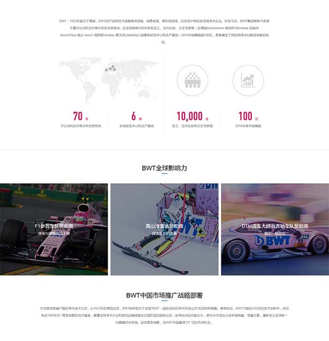 純凈世界集團有限公司創立于2013年,是一家集科研、設計、生產、銷售、營銷于一體的國際化高科技集團企業。公司實行多品牌業務國際化發展策略,旗下有“德國BWT”、“瑞典世瑞(SweAir)”、“德國Stntus(鮮途)”三大明星品牌陣容。自創立至今,純凈世界始終致力于人類生活的美好純凈世界,以“純凈世界,健康生活”的創新理念;專業的品牌、產品和服務,不斷向更廣泛、龐大的水凈、空凈、真空保鮮三大領域發起挑戰。