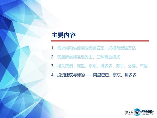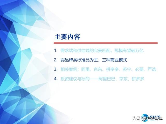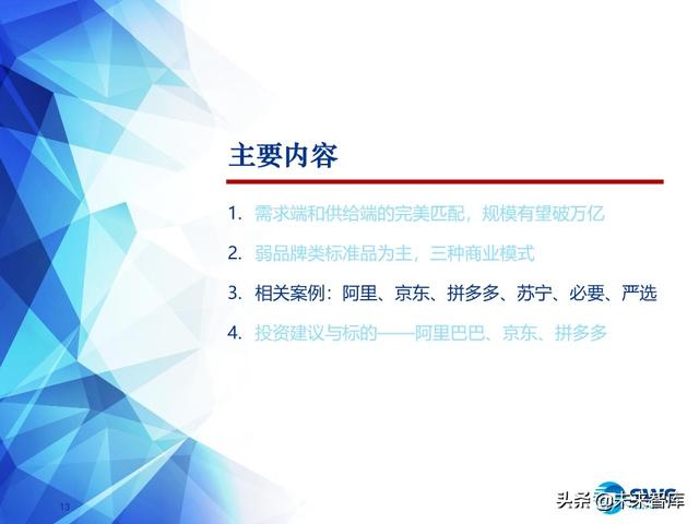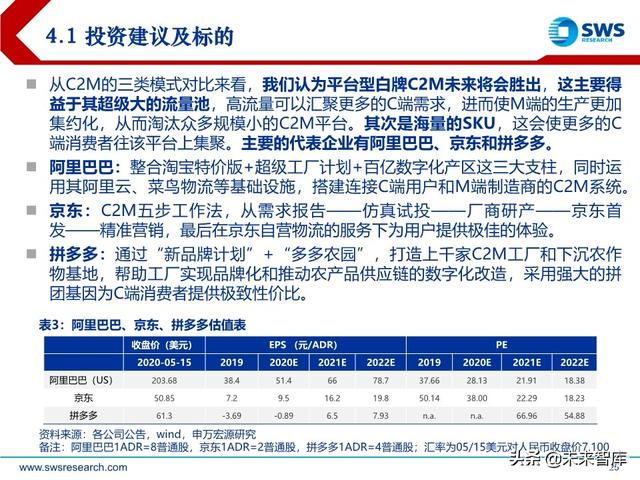 ? 從C2M的三類(lèi)模式對(duì)比來(lái)看,我們認(rèn)為平臺(tái)型白牌C2M未來(lái)將會(huì)勝出,這主要得 益于其超級(jí)大的流量池,高流量可以匯聚更多的C端需求,進(jìn)而使M端的生產(chǎn)更加 集約化,從而淘汰眾多規(guī)模小的C2M平臺(tái)。其次是海量的SKU,這會(huì)使更多的C 端消費(fèi)者往該平臺(tái)上集聚。主要的代表企業(yè)有阿里巴巴、京東和拼多多。