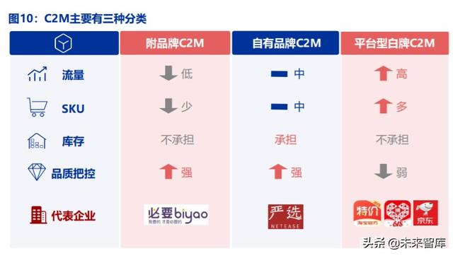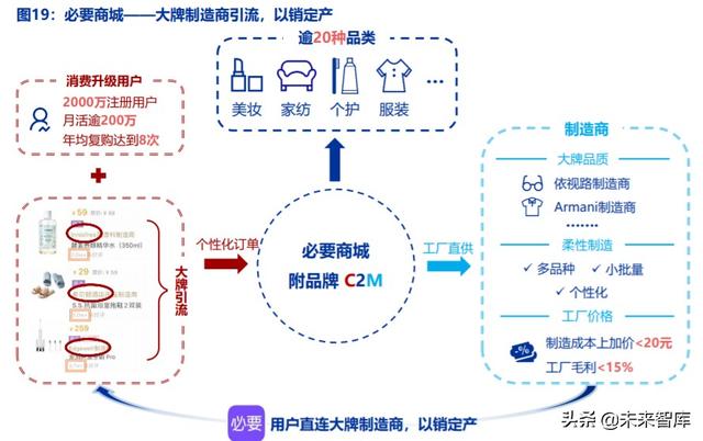 ? 我們根據(jù)各電商商城平臺(tái)對(duì)品牌的依附程度將C2M分為附品牌C2M、自有品牌C2M、平臺(tái) 型白牌C2M,附品牌類(lèi)C2M主要依靠知名品牌制造商概念來(lái)引流,自有品牌C2M主要 吸引對(duì)自身品牌有信賴(lài)度的客群,平臺(tái)型白牌C2M則面向平臺(tái)上所有用戶(hù)。