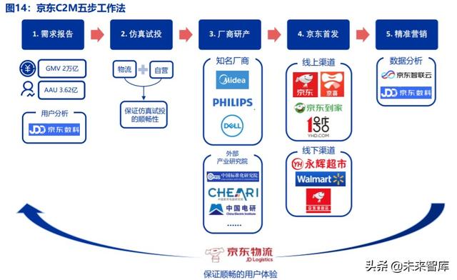 ? 京東:C2M五步工作法,從需求報(bào)告——仿真試投——廠(chǎng)商研產(chǎn)——京東首 發(fā)——精準(zhǔn)營(yíng)銷(xiāo),最后在京東自營(yíng)物流的服務(wù)下為用戶(hù)提供極佳的體驗(yàn)。