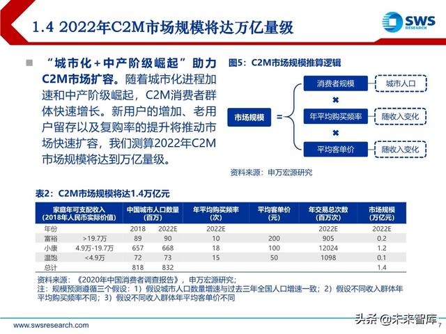 ? “城市化+中產(chǎn)階級(jí)崛起”助力 C2M市場(chǎng)擴(kuò)容。隨著城市化進(jìn)程加 速和中產(chǎn)階級(jí)崛起,C2M消費(fèi)者群 體快速增長(zhǎng)。新用戶(hù)的增加、老用 戶(hù)留存以及復(fù)購(gòu)率的提升將推動(dòng)市 場(chǎng)快速擴(kuò)容,我們測(cè)算2022年C2M 市場(chǎng)規(guī)模將達(dá)到萬(wàn)億量級(jí)。