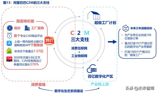 ? 阿里巴巴:整合淘寶特價(jià)版+超級(jí)工廠(chǎng)計(jì)劃+百億數(shù)字化產(chǎn)區(qū)這三大支柱,同時(shí)運(yùn) 用其阿里云、菜鳥(niǎo)物流等基礎(chǔ)設(shè)施,搭建連接C端用戶(hù)和M端制造商的C2M系統(tǒng)。