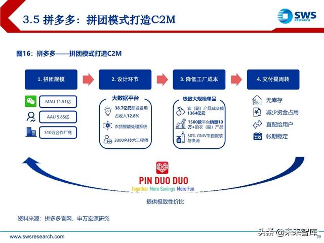 ? 拼多多:通過(guò)“新品牌計(jì)劃”+“多多農(nóng)園”,打造上千家C2M工廠(chǎng)和下沉農(nóng)作 物基地,幫助工廠(chǎng)實(shí)現(xiàn)品牌化和推動(dòng)農(nóng)產(chǎn)品供應(yīng)鏈的數(shù)字化改造,采用強(qiáng)大的拼 團(tuán)基因?yàn)镃端消費(fèi)者提供極致性?xún)r(jià)比。