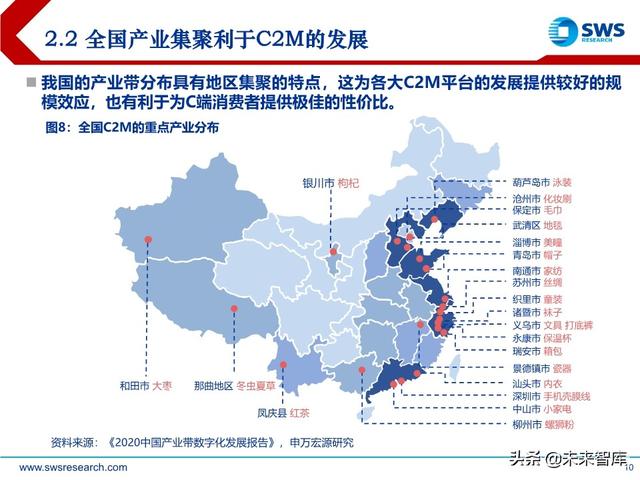 ? 我國(guó)的產(chǎn)業(yè)帶分布具有地區(qū)集聚的特點(diǎn),這為各大C2M平臺(tái)的發(fā)展提供較好的規(guī) 模效應(yīng),也有利于為C端消費(fèi)者提供極佳的性?xún)r(jià)比。