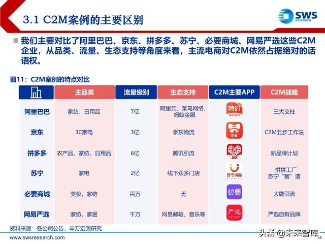 ? 我們主要對(duì)比了阿里巴巴、京東、拼多多、蘇寧、必要商城、網(wǎng)易嚴(yán)選這些C2M 企業(yè),從品類(lèi)、流量、生態(tài)支持等角度來(lái)看,主流電商對(duì)C2M依然占據(jù)絕對(duì)的話(huà) 語(yǔ)權(quán)。
