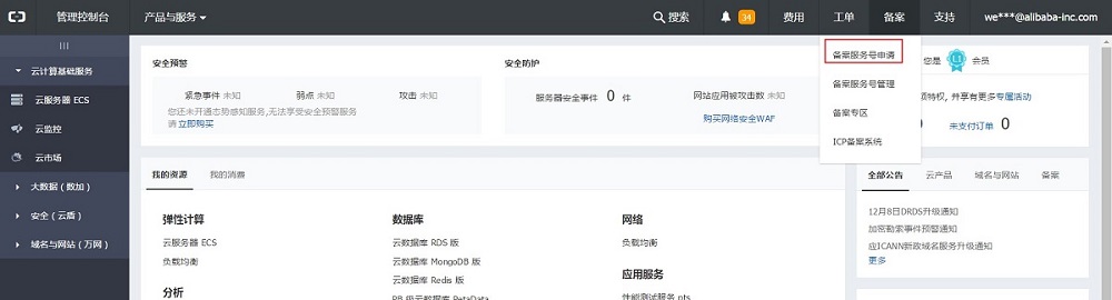 注意:2017 年 10 月 10 日起,ECS 服務器申請備案服務號需購買時長在 3 個月及以上(含續費)。
