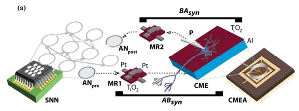 如下圖所示,這個系統其實是一條單向電路——鈦憶阻器 MR1 存儲突觸權重作為阻性狀態,超薄電容微電極 CME 將刺激傳遞給生物神經元,并通過記憶權重進行調節。BN 尖峰由膜片鉗微電極記錄,然后由憶阻器 MR2 處理,并且經由電流注入,最終傳輸到第二硅神經元 ANpost。