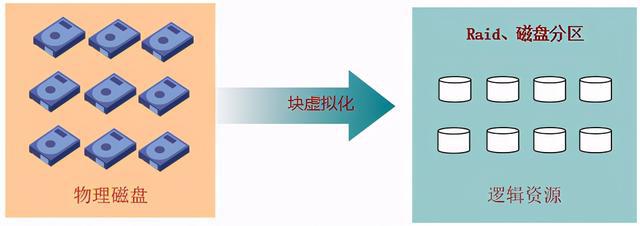 塊虛擬化是指對多塊硬盤建立RAID,劃分邏輯卷(LUN);