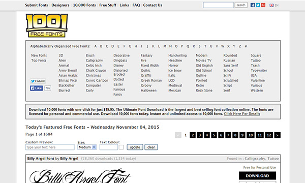 該網(wǎng)站不辜負它的名字,字體數(shù)量已經(jīng)超過了1001,而你可以從這個網(wǎng)站下載這些字體。在你尋找好的印刷術(shù)過程中這個網(wǎng)站應(yīng)該是一個偉大的發(fā)現(xiàn)。