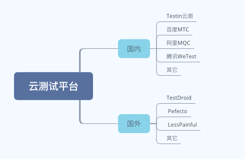 2014年左右,云測試模式開始吸引眾多玩家的目光,走出僅有Testin云測一個玩家的局面,既有垂直領域的創新者,也有BAT巨頭加入,例如百度MTC移動云測試中心、騰訊WeTest平臺、阿里MQC平臺等,在國外,類似的平臺也大范圍興起,如圖(圖片來源:自制):