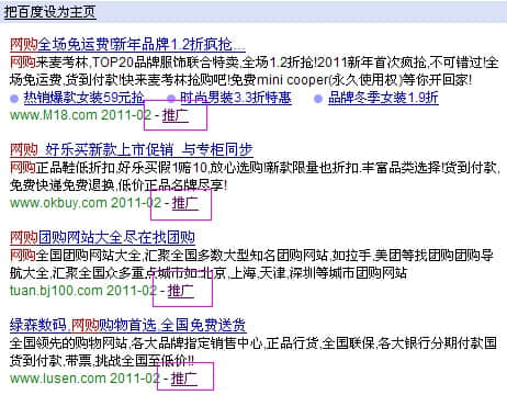 然后到百度搜下“網(wǎng)購”這關(guān)鍵詞,如圖,首頁前9項都被做“推廣”的占據(jù)了,然后接在下面的也都被大站占據(jù)了,這類極熱門的關(guān)鍵詞,如果沒有雄厚的資金,很難排名到首頁的,建議不要選擇!