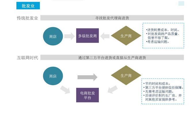 2、在互聯(lián)網(wǎng)繁榮到一定程度后,中間代理批發(fā)商的角色會逐漸消失,更多直接是B2C的取代。