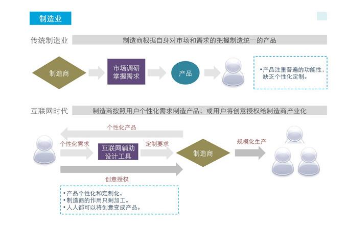 傳統(tǒng)的制造業(yè)都是封閉式生產(chǎn),由生產(chǎn)商決定生產(chǎn)何種商品。生產(chǎn)者與消費者的角色是割裂的。但是在未來,互聯(lián)網(wǎng)會瓦解這種狀態(tài),未來將會由顧客全程參 與到生產(chǎn)環(huán)節(jié)當(dāng)中,有用戶共同決策來制造他們想要的產(chǎn)品。也就是說,未來時代消費者與生產(chǎn)者的界限會模糊起來,而同時傳統(tǒng)的經(jīng)濟理論面臨崩潰。這也是注定 要誕生的C2B全新模式。