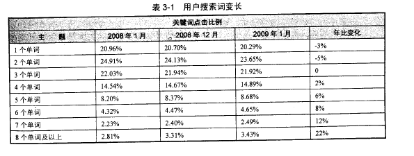 據著名市場調研公司Hitwise2009年2月的研究,用戶實際使用的搜索詞有越來越長的趨勢,如表3-1所示是2008年1月到2009年1月用戶搜索關鍵詞長度變化趨勢 。