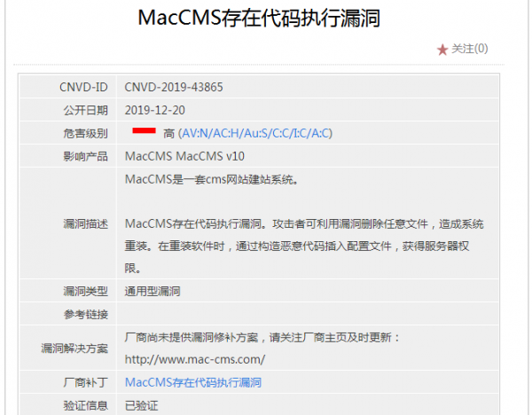 蘋果CMS V8 V10版本存在代碼重裝漏洞,以及代碼后門漏洞,任意文件刪除漏洞,通過CNVD-2019-43865的信息安全漏洞通報,可以確認maccms V10存在漏洞,可以偽造惡意代碼發送到網站后端進行執行,可以刪除網站目錄下的任意文件,可刪除重裝蘋果CMS系統的配置文件,導致可以重新安裝maccms系統,并在安裝過程中插入sql注入代碼到數據庫中去執行并獲取webshell以及服務器權限。