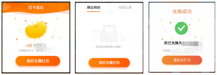多處尾部分享露出:在不影響體驗前提下,盡量在每個分支流程設置尾部分享按鈕,讓用戶大限度去分享。比如:在用戶簽到完會設置邀請banner,在賺豆攻略頁/打卡明細頁/邀請記錄頁/提現頁等都可以加分享邀請按鈕。