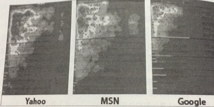 成都網(wǎng)站建設(shè)--創(chuàng)新互聯(lián)小編在那篇報(bào)道里看到過,在2009年Google官方博客也發(fā)布了一個(gè)類似的視線跟蹤實(shí)驗(yàn)結(jié)果,確認(rèn)enquiro.com的金三角圖像。Google的試驗(yàn)結(jié)果,成都網(wǎng)站建設(shè)--創(chuàng)新互聯(lián)小編發(fā)張?jiān)囼?yàn)結(jié)果圖,如下圖: