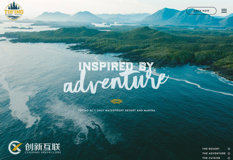 托菲諾度假村這個(gè)網(wǎng)站通過一個(gè)大背景圖片和一個(gè)完整的字體設(shè)計(jì)來創(chuàng)建一個(gè)類似海報(bào)的體驗(yàn)。 導(dǎo)航隱藏在右上角的漢堡包圖標(biāo)中。 CTA按鈕也用于避免重影并成為幽靈按鈕圖標(biāo)旁邊。