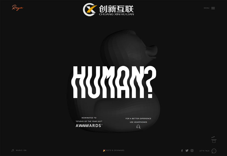 Ruya Digital選擇黑色背景的簡(jiǎn)單設(shè)計(jì)。 屏幕中央的動(dòng)畫和有趣的文字處理效果足以吸引用戶的注意力。 其他文字信息大多放置在屏幕的邊緣,使用戶可以盡可能地將焦點(diǎn)放在屏幕的中心。。 同樣,此頁面沒有導(dǎo)航設(shè)計(jì),而是將導(dǎo)航信息隱藏在漢堡包圖標(biāo)中。