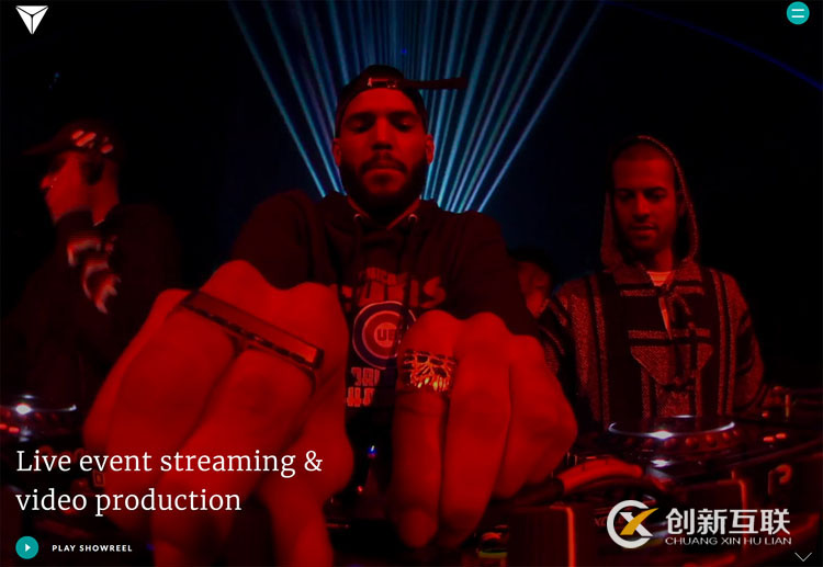 Flux Broadcast此頁面使用更加突出的視頻背景體驗(yàn)。 相應(yīng)地,屏幕上的其他元素被設(shè)計(jì)得不那么突出。 該網(wǎng)站為人們提供了視頻觀看體驗(yàn),而不是網(wǎng)站頁面。 導(dǎo)航被卷入漢堡包圖標(biāo),設(shè)計(jì)師為其添加了綠色背景,以便讓漢堡包圖標(biāo)不那么突兀。 在右下角的小動(dòng)畫箭頭鼓勵(lì)用戶在觀看視頻后循環(huán)播放。