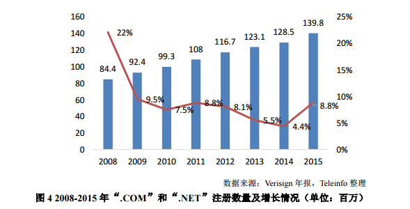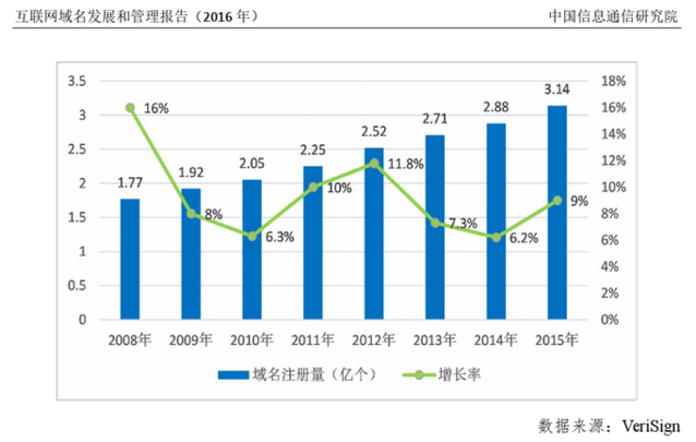 據中國信息通信研究院推出的《互聯網域名發展與管理報告(2016 年)》顯示,從 2008 年到 2015 年全球域名注冊量逐年增長,但增長率起伏變化大,且基本呈現連續兩年下滑或上升的趨勢。其中 2015 年全球域名注冊量一改頹勢,成功實現9%的增長幅度,這種情況很大程度上要得益于我國 2015 年域名投資和交易的火爆,這一年,米農豐收、市場活躍、儼然一副牛市狀態。