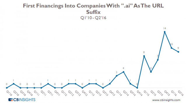 根據風投數據公司CB Insights 的相關數據顯示,“.ai”后綴名的初創公司中,成功獲得第一筆融資的公司數目在過去的 6 個季度大幅增加。并且 URL中包含“.ai”的初創公司,成功融資的數量在 2015 至 2016 年度飛速增長。單單就 2015 年第四季度的數目就已經達到 2014 年之前的數目總和,所以很多觀察人士紛紛指出,初創公司或許可以通過在URL中附加“.ai”后綴來降低融資難度。
