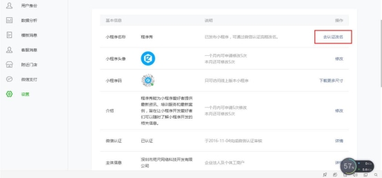首先登錄小程序后臺(tái),點(diǎn)擊設(shè)置,然后點(diǎn)擊小程序名稱右側(cè),“去改名”,接下來進(jìn)行微信認(rèn)證流程改名即可。