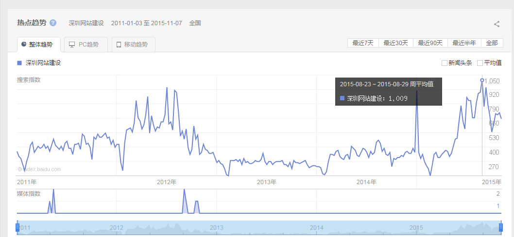 通過(guò)相關(guān)指數(shù)我們可以看到從2011年至2015年的行業(yè)搜索指數(shù)來(lái)看,深圳網(wǎng)站建設(shè)行業(yè)在2013、2014年趨勢(shì)有所下滑,從2015年開(kāi)始逐步上升,說(shuō)明市場(chǎng)需求有所加大,追其原因應(yīng)該有以下幾點(diǎn):其一就是隨著經(jīng)濟(jì)的發(fā)展,不斷涌現(xiàn)出新的公司,尤其是這兩年提倡自我創(chuàng)業(yè)的市場(chǎng)呼聲非常高,以致新公司和新隊(duì)伍不斷出現(xiàn),市場(chǎng)容量也隨之加大。其二就是國(guó)家倡導(dǎo)的“互聯(lián)網(wǎng)+”思維逐漸深入人心,傳統(tǒng)企業(yè)也在尋求互聯(lián)網(wǎng)產(chǎn)業(yè)鏈的突破,所以在風(fēng)站建設(shè)這一塊也加大了投入力度。其三,經(jīng)歷了2012年的網(wǎng)站建設(shè)高潮后,很多網(wǎng)站也到了改版更新的時(shí)候,很多企業(yè)也希望網(wǎng)站建設(shè)能跟上企業(yè)發(fā)展的步伐,此前很多