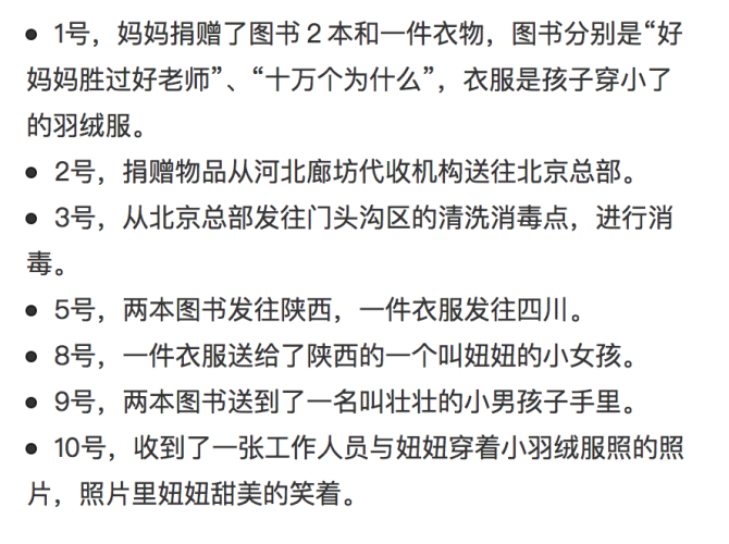 如下圖,這是我之前看到的一篇文章中描述的一段,事情是愛心媽媽捐贈了自己大孩子用過的物品,對于捐贈者來講,最擔心的是捐贈品一旦出手,就好像人間蒸發了一樣,那么這個時候,如果你能看到捐贈品每一個環節的流通,看到被捐贈者和贈品的互動,你是不是感覺很暖心。減少捐贈者的擔憂,也讓產品更加感性。