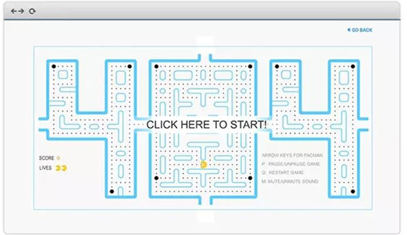 同樣的404頁被制作成小游戲。 該公司選擇了經(jīng)典的街機游戲Pacman。