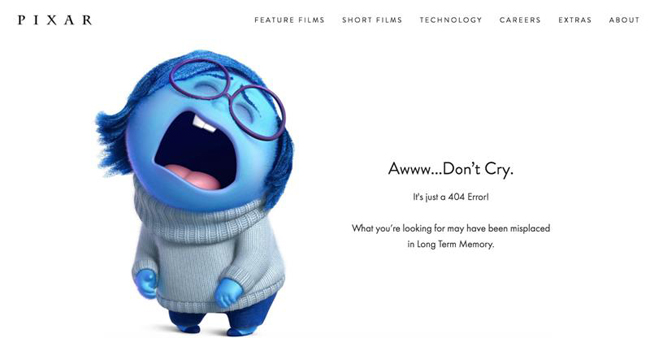 皮克斯的404頁面使用“特務(wù)團隊”中的“擔(dān)心”在屏幕上哭泣,并附有“Awww ... Do not Cry”字樣。