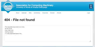 這是伊利諾伊州Champaign計算機協(xié)會網(wǎng)站的404頁面,其中一段文字將會一個接一個地寫,告訴你,它無法找到該頁面,甚至“爬到垃圾箱并 分解自己。“